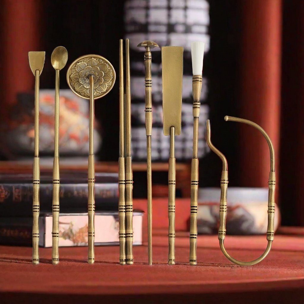 The Antique Lotus Theme Pure Copper Agarwood Loose Powder Ash Incense Ceremony Burner Kit with Stencil includes: 1 Incense Stencil,1 Incense Brush,1 Ash Press,1 Incense Spoon,1 Incense Shovel,1 Cone Incense Mold.