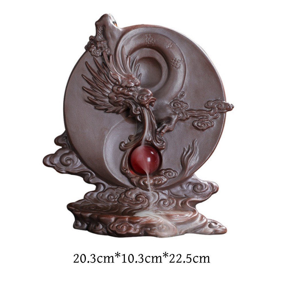 The Antique Purple Clay Ceramic Dragon Waterfall Incense Backflow Burner in style A measures 20.3 cm in height, 10.3 cm in width, and 22.5 cm in depth, offering a compact yet visually impactful presence in any room.