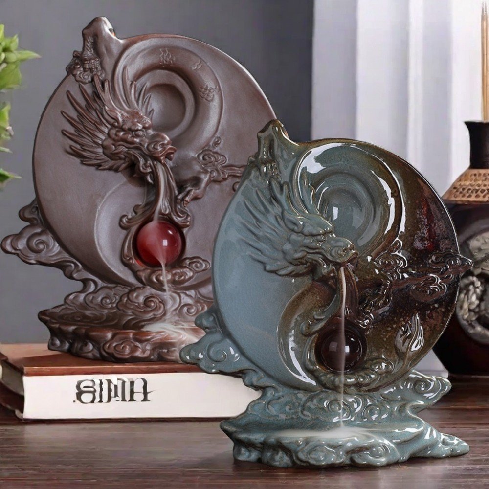Crafted from the finest purple clay, this Antique Purple Clay Ceramic Dragon Waterfall Incense Backflow Burner showcases an exquisitely detailed dragon coiling around a stylized waterfall. This design is steeped in ancient symbolism and reflects modern craftsmanship. As the incense cone burns, smoke gently cascades down the dragon’s body and into the pool below, creating a visual spectacle reminiscent of a misty, ethereal waterfall. This piece not only serves as a stunning focal point in any room but also enhances the environment with calming, aromatic plumes that help in relaxation and meditation. The burner’s practical design ensures it is easy to use and clean, making it an essential accessory for anyone looking to create a peaceful haven in their home or office. It is perfect for use during yoga or meditation sessions, or simply to unwind after a long day. The intricate craftsmanship and historical design make this burner a captivating gift for lovers of unique home decor, spiritual practices, or anyone who appreciates the art of incense burning.