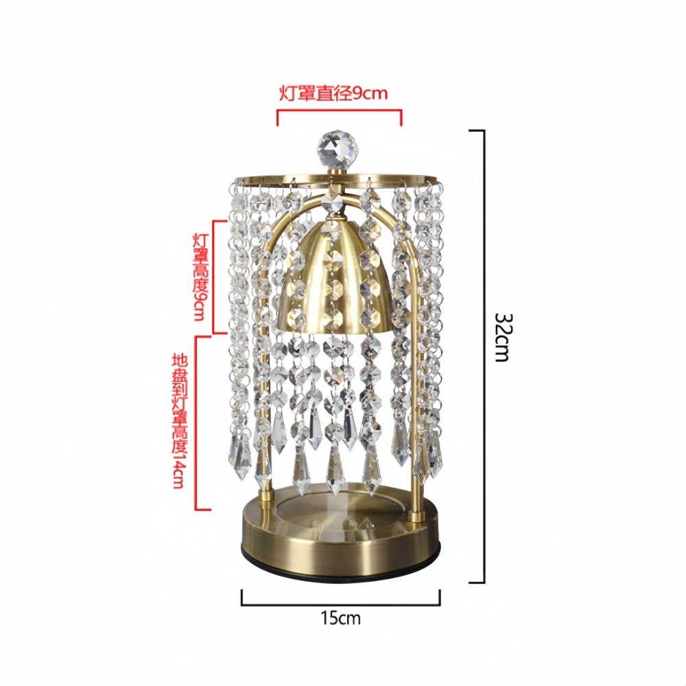 The Best Elegant Crystal Metal Electric Dimmable Wax Candle Warmer Lantern measures 32 cm in height, with a base diameter of 15 cm. The lampshade diameter is 9 cm, making it a compact and elegant choice for any space.