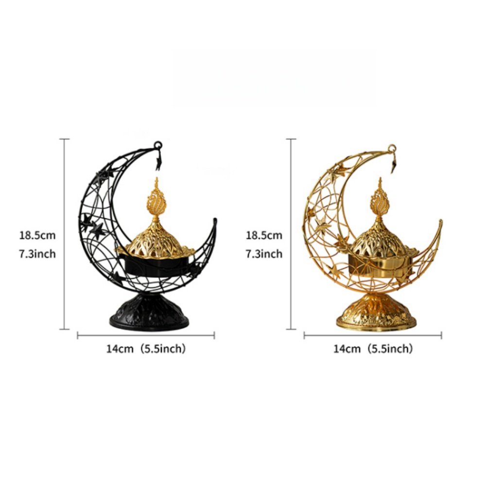 The Black and Golden Arabic Hollowed Moon and Star Theme Metal Vintage Catholic Incense Burner measures 18.5 cm in height and 14 cm in diameter, offering a compact yet visually striking design suitable for various spaces.