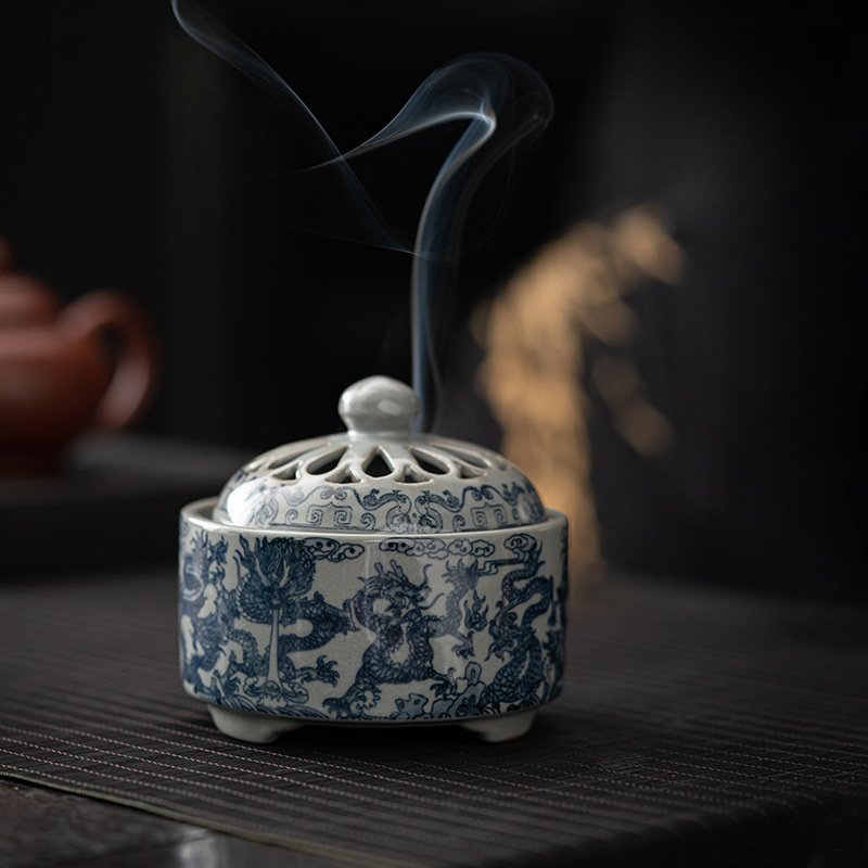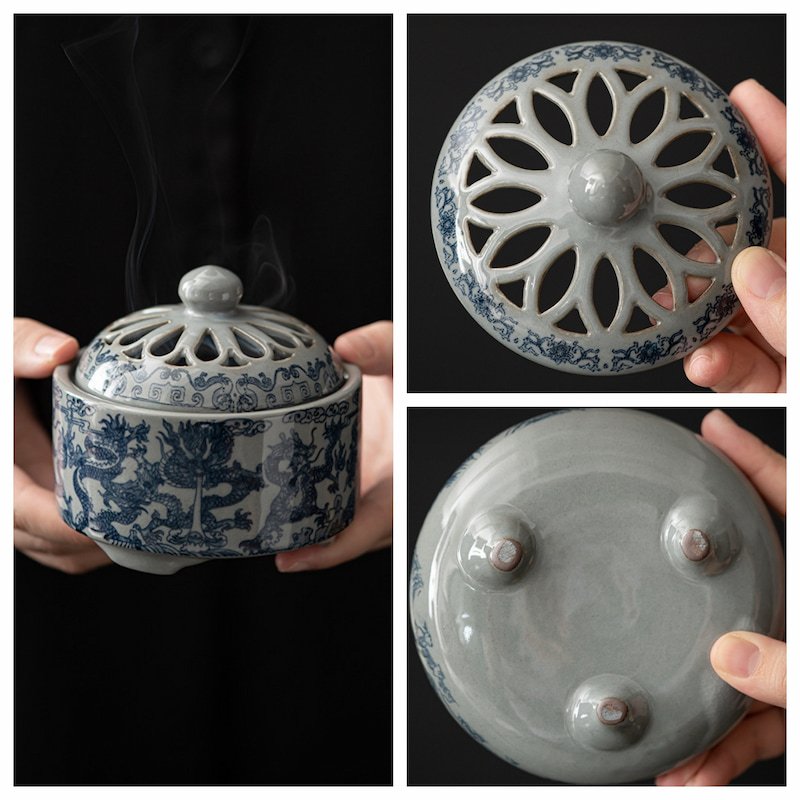 Handmade with high-quality ceramic, this Blue and White Porcelain Dragon Theme Cone incense burner is both durable and aesthetically pleasing. The high-temperature firing process ensures a smooth, lustrous finish that is easy to clean and resistant to wear. The multi-hole lid design allows for even and graceful dispersion of incense smoke, creating a calming atmosphere.