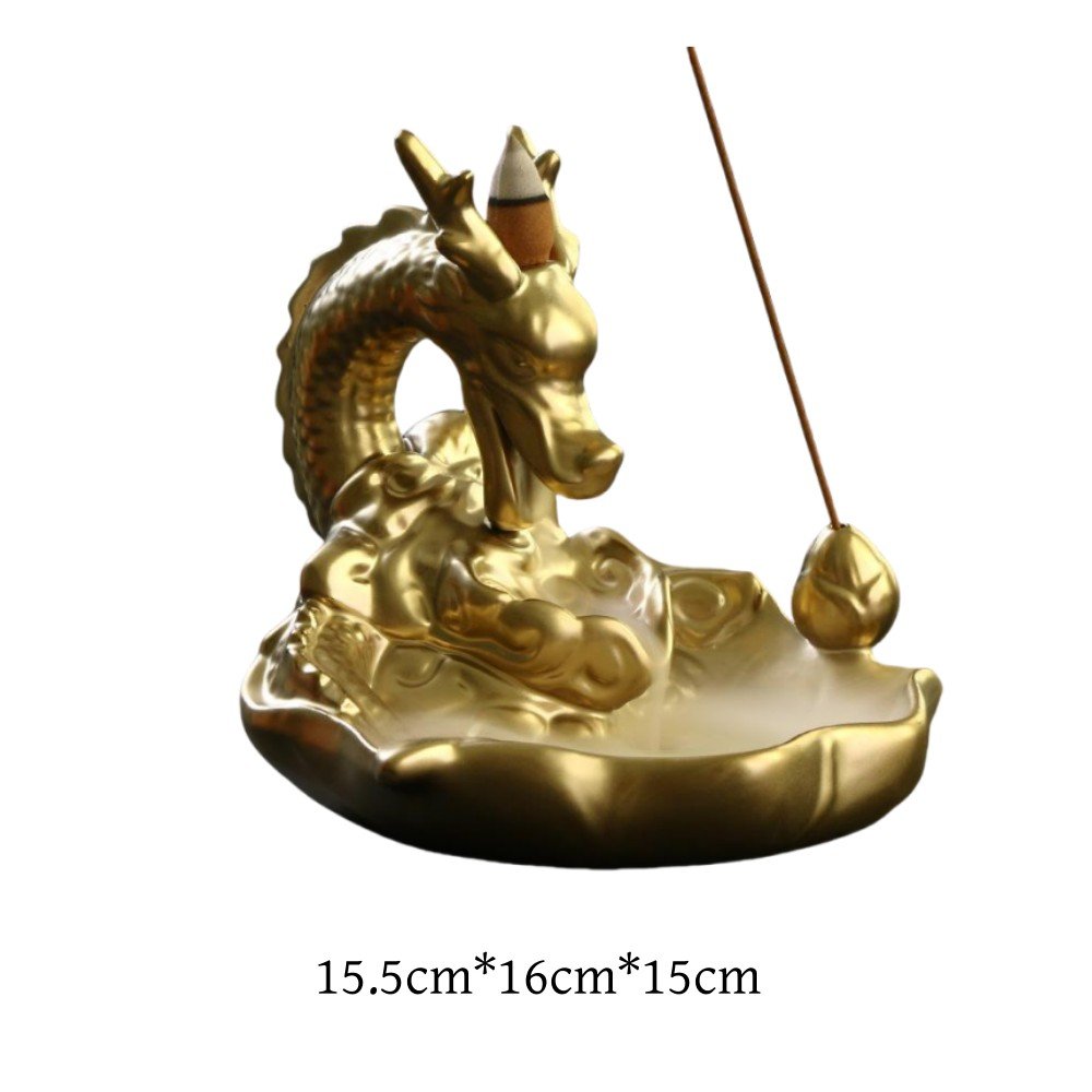 The Ceramic Golden Dragon Backflow Incense Burner Waterfall Holder measures approximately 15.5 cm in height, 16 cm in width, and 15 cm in depth, making it a compact yet striking addition to any interior space.