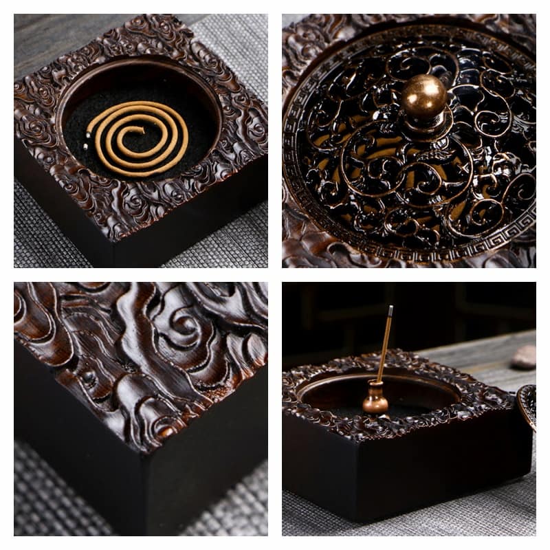 The Chinese Antique Square Black Wood Cone Incense Holder Box is designed with user convenience in mind. It includes a fireproof cotton insert for safe use with coil incense, allowing you to enjoy the soothing aroma without any worries. The gourd-shaped incense holder adds a touch of traditional charm and makes it easy to place your incense. Whether you’re using it for meditation, relaxation, or simply to add a fragrant touch to your home, this incense holder is the perfect blend of beauty and functionality.