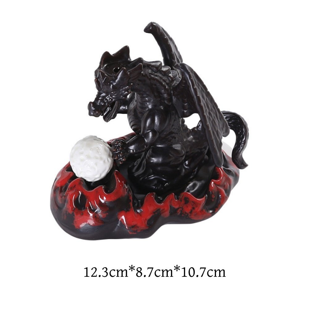 This Creative Black and Red Ceramic Backflow Dragon Incense Holder measures 12.3 cm in length, 8.7 cm in width, and stands 10.7 cm tall, featuring a striking dragon poised dynamically over a vibrant red base.