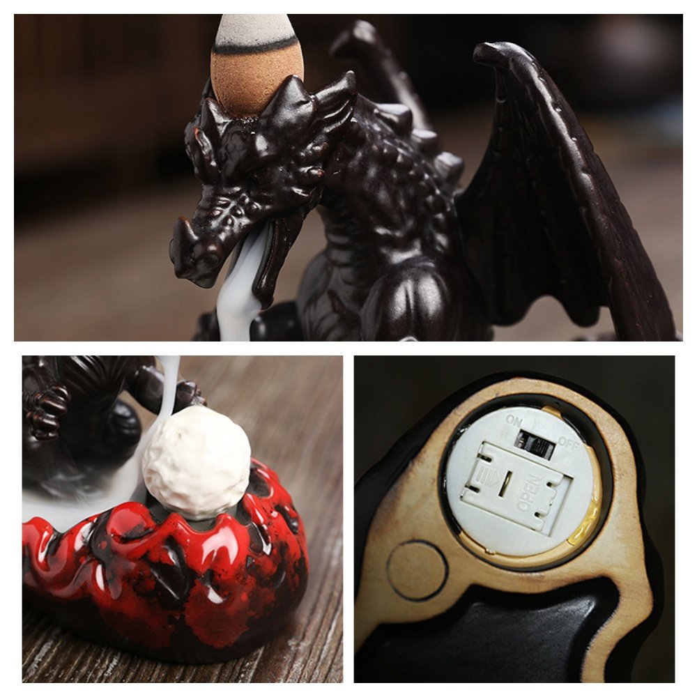 Bright LED Lighting, Dynamic Dragon Design, Gradient Color Scheme, Smoke Backflow Functionality, Sturdy Ceramic Build