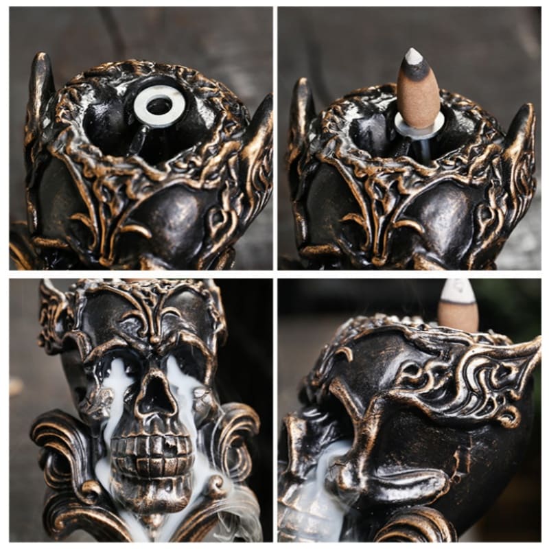 This striking incense burner, crafted from high-quality resin, features a detailed skeleton design that brings a macabre charm to any setting. As the incense cone burns, the smoke flows down through the eye sockets and mouth, creating a mesmerizing backflow effect that adds an eerie yet captivating ambiance to your space. Perfect for creating a calm and tranquil atmosphere, this incense holder is not only a functional piece but also an intriguing conversation starter.