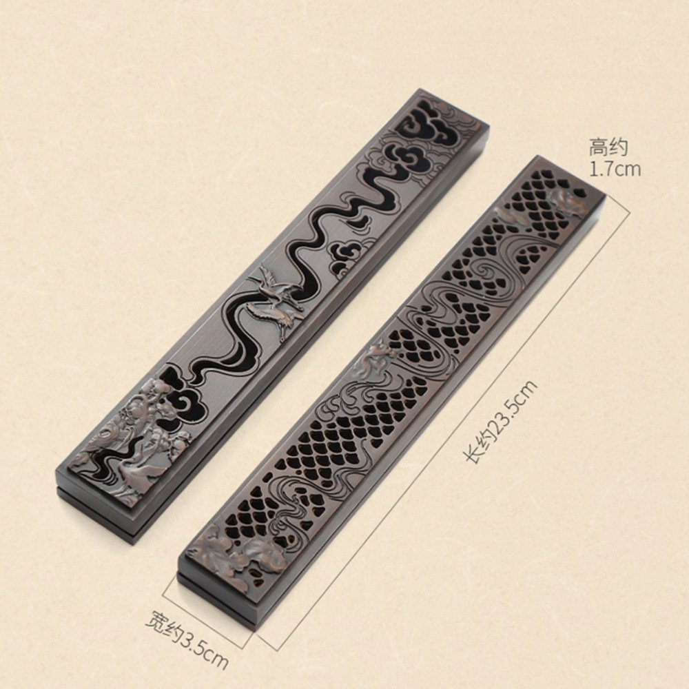 The Lotus and Crane Theme Traditional Handmade Copper Incense Burner measures 23.5 cm in length, 3.5 cm in width, and 1.7 cm in height, showcasing a conical coffin design with intricate hand-carved patterns for a luxurious and functional addition to any space.
