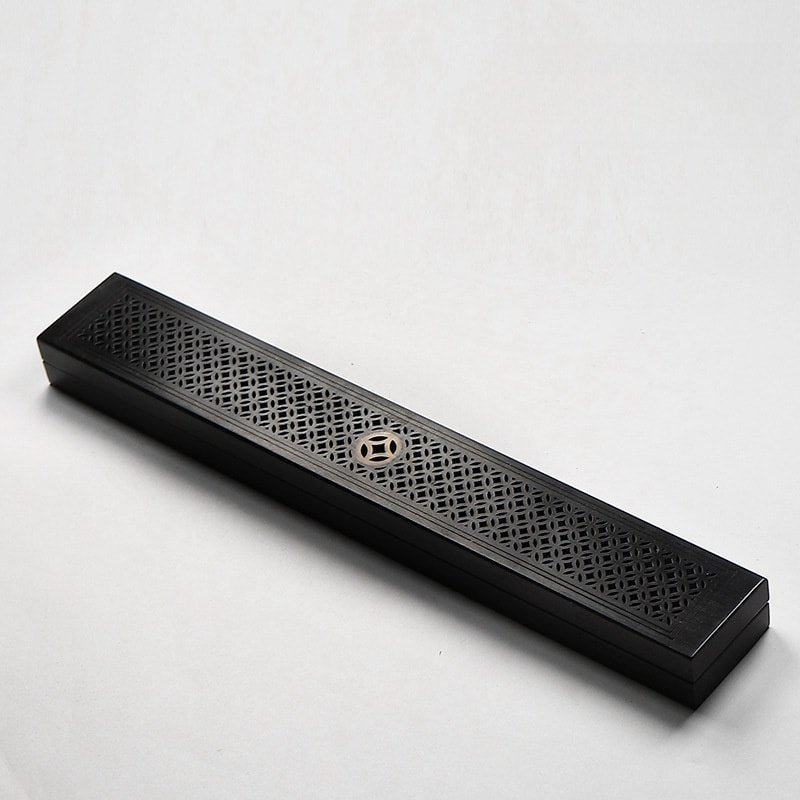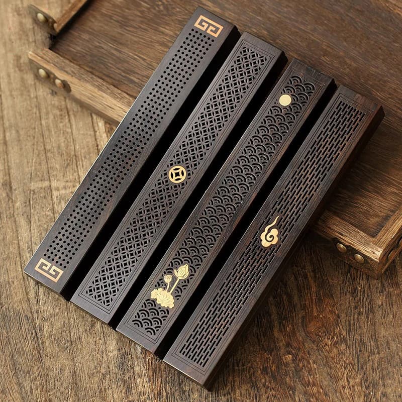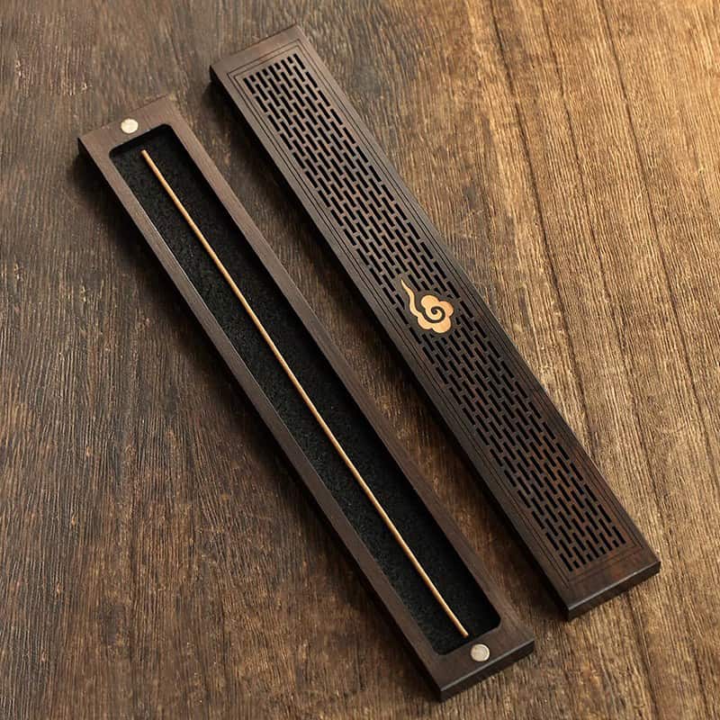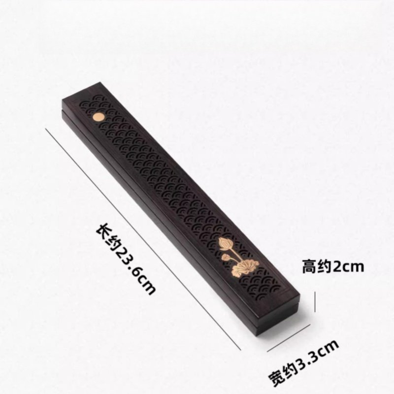 Made from high-quality black sandalwood and adorned with intricate boxwood inlays, this incense holder showcases traditional craftsmanship at its finest. The meticulous hollow carving and classic patterns not only enhance its aesthetic appeal but also allow the incense smoke to disperse gracefully, creating a tranquil and aromatic atmosphere. Ideal for incense sticks up to 21cm, it features a fireproof cotton liner and a magnetic lid for safe and convenient use.